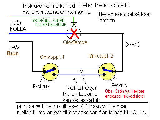Rent generellt så kopplas fas till en p-skruv och den andra brytarens p-skruv kopplas till lampan
